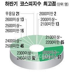 하반기 지수 고점을 묻는 질문에는 ‘2200 이상~2300 미만’을 제시한 응답자가 26.5%(97명)로 가장 많았다. ‘2300 이상~2400미만’을 꼽은 응답자도 25.2%(92명)로 비슷했다.
