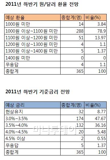 전체 응답자(365명) 중 288명(78.9%)이 올 하반기 원/달러 환율이 1000원 이상~1100원 미만이 될 것이라고 답했다.