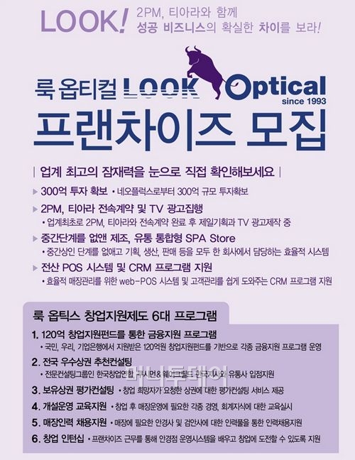 각각 오전 10시 30분에 시작하는 사업설명회에서는 룩옵티컬 브랜드 소개와 경영목표, 마케팅 차별화 및 가맹 안경원 지원 시스템 등 유익한 내용을 소개하고 행사 후 개설 상담을 진행할 계획이다.