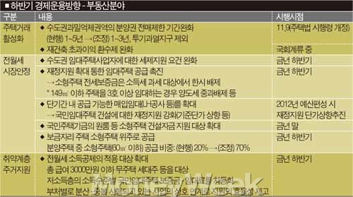 재건축 초과이익 환수제의 완화도 추진된다. 재건축사업에 따른 초과이익을 거둬들여 주택가격의 안정과 사회적 형평성을 높이기 위해 지난 2006년에 도입한 제도다. 국토해양부는 구체적인 안을 확정하지 않았지만 폐지보다 부담금을 낮추는 방안을 검토하고 있다.