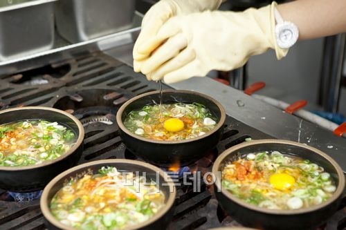 '현대옥'은 주방장이 필요 없다. 용인 죽전점 조윤정 대표는“일단 메뉴가 단일 품목이라 매장 관리가 편하다”면서 “특별한 조리비법이나 능력이 따로 필요하지 않아 초보자도 쉽게 운영할 수 있다”고 말한다. 육수를 농축시켜 각 가맹점으로 공급하고 있기 때문에 조리가 간편하다. 정수한 물을 육수 농축액과 배합하면 육수는 완성이다. 육수는 항상 끓고 있다. 남부시장식 콩나물국밥이 나오는 데 걸리는 시간은 2분, 끓이는 식은 4분이다.