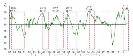 미국 ISM제조업지수가 하락했지만 확장을 의미하는 기준선 50선 위에 여전히 놓여있다. 물론 하락이 앞으로도 지속된다면 기준선 아래로 내려가겠지만, 대세상승국면에서도 이번처럼 ISM제조업지수가 하락하다가 다시 돌아선 사례들이 많기 때문에 미리 예단할 수는 없다.