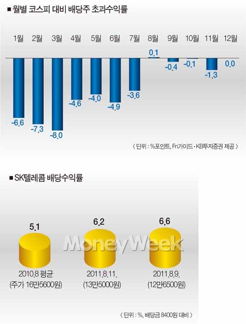 김수영 KB투자증권 연구원은 "배당주를 연말까지 보유한다고 가정하면 8월에 매수하는 것이 가장 수익률이 높다"며 "8월에 매입했을 때는 코스피지수보다 0.1%포인트 높은 수익을 올릴 수 있다"고 말했다.
