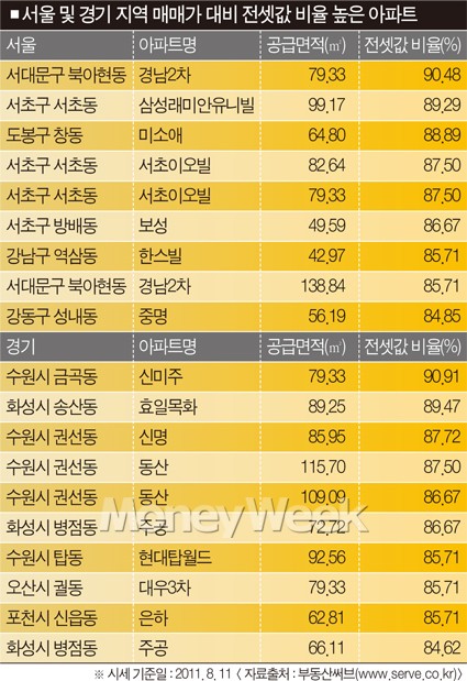 서초구 서초동의 삼성래미안유니빌 99m²(30평형)는 매매가가 2억8000만원이며, 전셋값은 2억5000만원으로 전세값 비율이 89.29%에 달했다. 이밖에 도봉구 창동 미소애 65m²(19평형), 서초동 서초이오빌 79m²와 83m²(25평형) 등이 매매가 대비 전셋값 비율이 87% 이상인 아파트들이다.