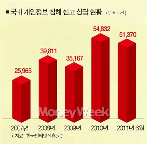 국내에서 해킹사건은 한해 수만건씩 발생한다. 한국인터넷진흥원에 접수된 개인정보 침해신고와 상담건수만 최근 3년간 13만건에 달했다. 20087년 3만9811건, 2009년 3만5167건이던 것이 지난해 5만4832건으로 크게 늘었다. 2005~2007년의 개인정보침해 피해규모는 무려 10조7000억원으로 추정된다.