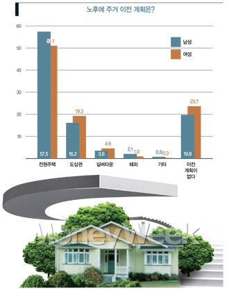 주거를 옮긴다면 그 형태에 대해서는 ‘전원주택’이 70.3%로 압도적인 희망을 보였으며, 그 뒤를 이어 ‘도심권’ 21.8%, 실버타운 4.9%, 해외 2.2%로 나타났다. 그러나 자영업자와 전문직 종사자 중에서는 해외에서 노후를 보내겠다는 응답자가 한명도 없었다.