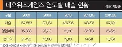 네오위즈게임즈가 무엇보다 큰 폭의 성장률을 기록한 것은 바로 해외사업 부분이다. 매년 폭발적인 성장을 이어나가며 2010년 한해 1606억원의 매출을 올린 데 이어 올 1분기, 703억, 2분기엔 901억원을 기록해 전체 매출 비중의 54%를 차지했다.