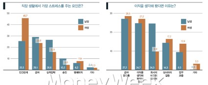 성별에 따라 직장에서 압박을 가하는 스트레스가 다른 것으로 조사됐다. 성별로 보면 남성의 경우는 급여(29.1%)를 직장 내 가장 큰 스트레스 요인으로 꼽았으며, 실적압박(26.6%)과 인간관계(25.5%)가 그 뒤를 이었다. 그러나 여성의 경우에는 응답자의 절반에 가까운 45.7%가 인간관계를 가장 큰 스트레스 요인으로 꼽았으며, 급여가 23.8%로 그 뒤를 이었다. 실적압박을 15.9%로 상대적으로 낮았다. 특히 전문직 급여생활자의 경우 일반 회사원보사 인간관계에 대한 스트레스(전문직 45.9%, 회사원 27.7%)가 더 높은 것으로 조사됐다.