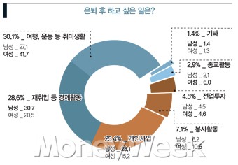 ‘은퇴 후 무슨 일을 하고 싶은가’에 대한 질문에 대해서는 응답자의 30.1%가 ‘여행·운동 등 취미생활’이라고 답해 은퇴 후 삶의 여유를 찾고 싶어 하는 기대 심리를 드러냈다.