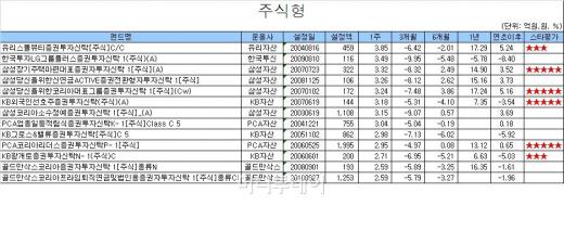 삼성운용의 삼성그룹주펀드인 '삼성당신을위한코리아대표그룹증권투자신탁 1[주식](Cw)'와 대형주 편입 비중이 높은 KB운용의 'KB외국인선호주증권투자신탁(주식)(A)', 삼성운용의 압축형펀드 '삼성코리아소수정예증권투자신탁 1[주식]_(A)' 등도 평균 이상의 성적으로 선전했다.