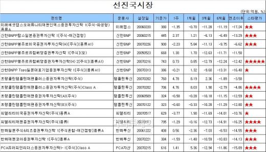 선진시장에 투자하는 펀드들은 투자 지역별로 수익률 편차가 뚜렷했다. 일본 시장에 투자하는 '프랭클린템플턴재팬플러스증권자투자신탁(주식)', '신한BNPP탑스일본증권투자신탁 1[주식-재간접형]' 등은 2~4%대 수익률로 선방했지만 '신한BNPP봉쥬르미국증권자투자신탁(H)[주식](종류A1)', '피델리티미국증권자투자신탁(주식)종류A' 등 미국시장에 투자하는 펀드들은 미국 증시 급락 여파 속에 -3~4% 수익률에 그쳤다.