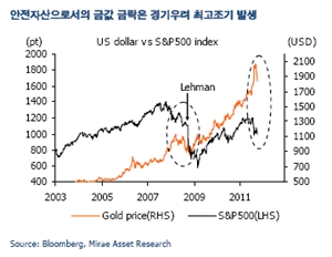 한편 이재훈 미래에셋 연구원은 "2008년 신용위기 당시 급락세로 돌아섰던 상황과 유사하다"는 의견을 제시했다. 당시 신용위기 때 금값은 지금처럼 한동안 주가와는 반대로 급등하다 리먼 파산 직전 급락세로 전환한 바 있다.