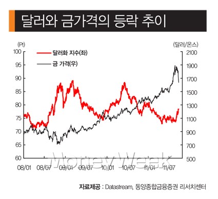 전문가들은 최근 금값의 급락의 주요 원인을 '달러와의 상관계수'에서 찾는다. 같은 안전자산 성격을 지닌 달러가 강세를 보이고 있기 때문이라 풀이한다. 이규원 삼성선물 연구원은 "그리스 디폴트 가능성이 9월 들어 본격적으로 제기되면서 달러가 유로 대비 강세를 나타내기 시작했다"며 "이러한 달러와 금은 '마이너스'로 역의 상관관계가 뚜렷하다"고 말했다. 달러가 강세를 띠면서 대체재 역할을 했던 금이 힘을 잃고 있다는 것이다.