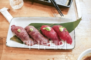 백화점처럼 작은 가게 여러 개가 입점해 있는 니쿠스시 점포는 고기·생선스시, 불고기, 철판구이 등 4개 공간을 활용하고 있다. 테이블은 16개, 회전율 10회, 매출은 1일 120명에 400만원 정도다.