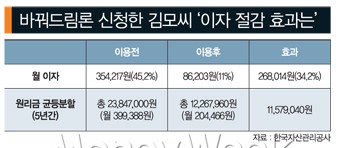 저금리 대출로 갈아타기 전 김씨는 5건의 대출 모두 합쳐 이자만 월 35만4217원(45.2%)을 지불해야 했다. 하지만 11% 저금리 대출로 갈아타면서 매달 부담해야 되는 이자가 8만6203원으로 크게 줄었다. 월 26만8014원(34.2%)을 아끼게 된 셈이다.