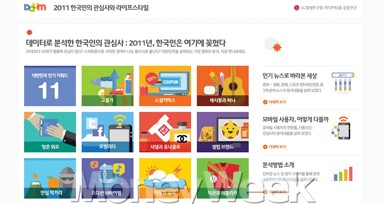 다음 커뮤니케이션이 최근 LG경제연구원과 함께 재미있는 조사 결과를 내놓았다. 뉴스, 검색 등 미디어 소비 행태를 잣대로 소비자들의 관심사를 파악해 ‘2011 대표 키워드’를 선보인 것. 한국인들은 2011년 무엇에 가장 큰 관심을 보였을까? 이중 눈여겨 볼 만한 '2012년 소비&라이프 트렌드'를 짚어보았다.