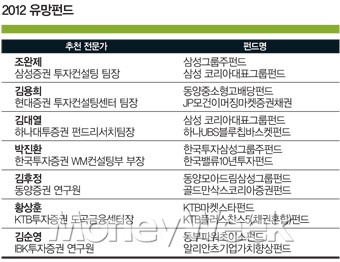 국내 증권사의 펀드 전문가 7인을 통해 '2012년 주목할 만한 펀드 14선(중복 포함)'을 추천받았다. 대체로 국내 대표그룹주펀드가 올 한해 펀드시장의 인기를 주도할 것으로 예측되는 가운데 성과가 검증된 가치주펀드와 채권펀드로 안정적인 수익을 추구하라는 조언이 많았다.