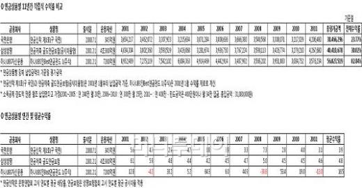 25일 머니투데이와 KDB대우증권(67,300원 ▲6,200 +10.15%)이 개인연금상품이 도입된 지난 2001년부터 지난해까지 11년간 국내 대표 연금신탁, 연금보험, 연금펀드의 적립식 수익률을 조사한 결과, 연금펀드가 압도적인 수익률로 1위를 차지했다.
