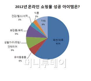 ㈜코리아센터닷컴(대표 김기록)이 자사 전자상거래 통합 솔루션 서비스인 ‘메이크샵’(www.makeshop.co.kr)을 이용하는 쇼핑몰 대표 192명을 대상으로 설문 조사한 결과, 올해 매출이 가장 상승할 것 같은 쇼핑몰 아이템은 패션/의류 분야가 61%로 압도적인 1위를 차지했다.