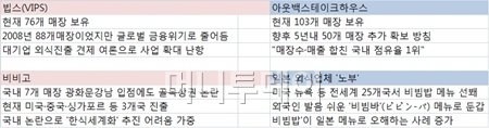 반면 아웃백의 대항마로 꼽히는 토종 외식브랜드 빕스는 매장수 확대가 여의치 않은 상황이다. 대기업 계열 외식업체로 민심이 좋지 않은데다 경쟁사의 점포 선점 등으로 여러 상황이 여의치 않다. 현재 토종 브랜드인 빕스 매장수는 76개로 외국계 아웃백의 2006년 점포수(88개)에도 훨씬 못 미친다.