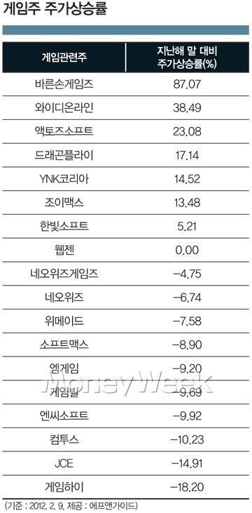 현 상황은 좋지 않지만 어쨌든 게임주의 비중확대가 유효하다는 게 전문가들의 대체적인 견해다. 최경진 신한금융투자 연구원은 "게임 업종에 대한 비중확대 의견을 유지하고 저가매수 시각을 견지한 바텀업(Bottom-up)대응을 권한다"고 밝혔다.