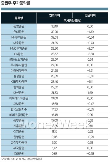 에프앤가이드가 조사한 올해 증권주들의 주가 흐름을 보면 '승승장구'란 표현이 무리가 아니다. 연초 대비 2월10일 현재 증권주 중 가장 높은 주가상승률을 보이고 있는 종목은동양증권(5,190원 ▲90 +1.76%)으로, 무려 33.18% 올랐다. 현대증권과NH투자증권도 각각 32.25%와 32.03% 상승률로 뒤를 이었으며, 대우증권도 31.25%의 높은 상승률을 기록했다.