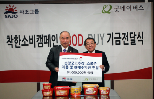 이날 사조그룹은 2011년 한해 동안 모은 6000만원 상당의 수익금과 제품을 굿네이버스에 전달하고, 2012년의 지속적인 후원을 약속했다.