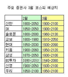 28일 삼성, 우리, 현대, SK, 신영 등 국내 10개 증권사에 따르면 3월 코스피지수는 저점이 1900~1960, 고점은 2050~2130에 이를 것으로 전망됐다.