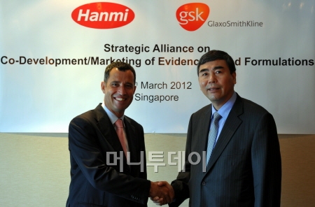 한미약품(507,000원 ▲2,000 +0.4%)(대표이사 이관순)이 영국계 제약회사인 글락소스미스클라인(이하 GSK)과 복합 개량신약 공동 개발 및 판매를 위한 전략적 제휴 계약을 체결했다고 27일 밝혔다.