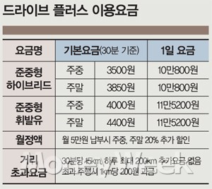 회사의 이용 연회비는 5만원, 가입비는 3만원이지만 현재 시범운행 중이라 이 요금을 받지 않는다. 주중 이용요금은 소형차와 하이브리드카가 1시간 기본에 30분당 3500원이다. 주말에는 3850원으로 조금 높아진다. 휘발유 차량은 주중 4000원, 주말 4400원이다. 운임이 싸다보니 자기 차량이 있음에도 카쉐어링을 이용하는 고객도 있을 정도다.