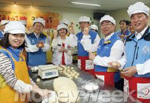 이날 진행된 '따뜻한 국수나눔' 행사에서 그들은 늘 입던 검은색 재킷을 벗고 각자 허리에 앞치마를 둘렀다. 요리사 모자까지 눌러쓴 이들의 모습은 권위 있는 금융 CEO가 아닌 영락없는 옆집 아저씨였다. 이날 한 회장과 CEO들은 서툰 솜씨지만 정성을 다해서 직접 밀가루를 반죽해 국수가락을 뽑았다.