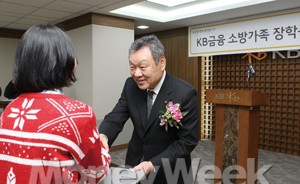 어윤대 KB금융회장이 순직·공상 소방관 자녀에게 장학금을 전달하는 모습.