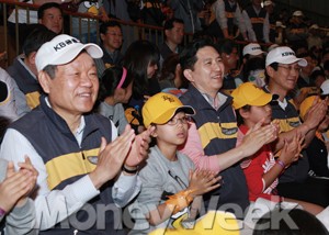 '꿈나무마을 사랑만들기'에서 초등학생들과 추억을 만드는 어윤대 회장(왼쪽)과 임직원들.