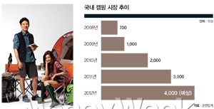 유통업계에 따르면 올해 캠핑시장 규모는 지난해보다 30% 이상 늘어난 4000억원대를 돌파할 것으로 예상된다. 지난 2009년 1000억원에 불과했던 시장이 불과 3년 만에 4배로 껑충 뛰어오른 것이다. 4조원대에 이르는 등산용품 시장에 비하면 10분의 1 수준에 불과하지만 최근 2~3년 사이 그 성장속도는 상당히 가파르다.