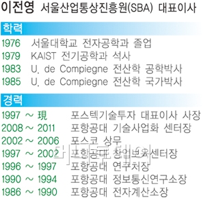 지난달 14일 서울시 산하기관인 서울산업통상진흥원(이하 SBA) 새 대표이사에 포스텍기술투자 대표를 역임한 이전영 포항공대 부교수가 임명됐다.