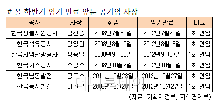 현재 올 하반기 임기가 끝나는 지경부 산하 공기업 사장은 △김신종 한국광물공사 사장(7월29일) △정승일 한국지역난방공사(74,700원 ▼2,300 -2.99%)사장(9월27일) △주강수한국가스공사(35,750원 ▼850 -2.32%)사장(10월1일) △장도수 한국남동발전 사장(10월27일) △이길구 한국동서발전 사장(10월27일) 등이다. 최근 감사원으로부터 특혜대출 의혹을 받은 김신종 광물자원공사 사장만 빼고 나머지 사장들은 내년 초까지 연임될 것으로 알려졌다.