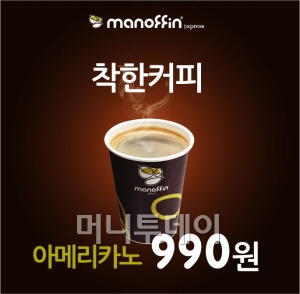 수제머핀 커피전문점 <마노핀>은 아라비카 커피의 대표 원산지인 에티오피아와 콜로비아산 원두로 만든 아메리카노를365일 990원의 착한 가격에 판매한다.
