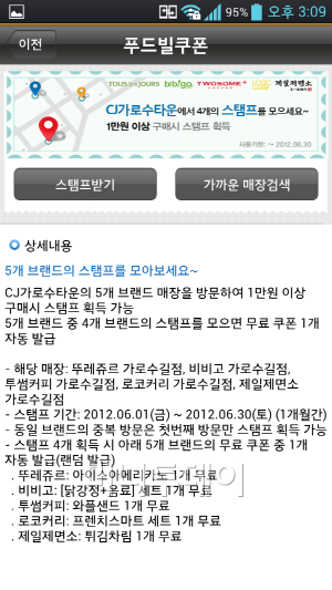 종이쿠폰과 달리 스마트폰만으로 간편하게 참여할 수 있는 이벤트라, 고객 활용도 및 편의성을 배려한 점이 특징이다. '푸드빌쿠폰'앱은 현재 14만 명이 다운로드 받아 이용하고 있다.