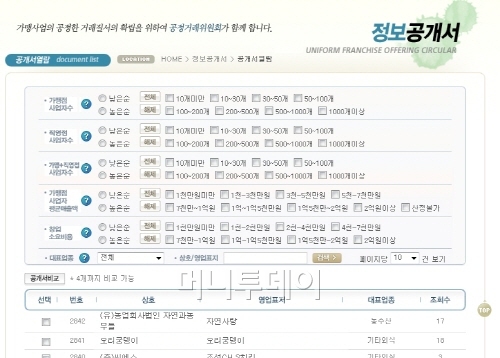 공정거래위원회 가맹유통과가 운영중인 '가맹거래'홈페이지상에 11일 정보공개서 전체등록수가 2842개로 축소된 것으로 나타났다.