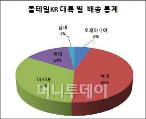 대륙 별로는 미국, 캐나다 등 북미 지역이 전체 45%를 차지하며 국내 쇼핑몰을 가장 많이 이용한 것으로 조사됐고, 뒤를 이어 아시아가 33%, 유럽 14.2%, 오세아니아 5.3%, 남미 2.5% 순이었다.