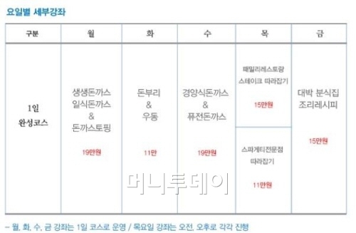 매주 요일별로 강좌가 진행되며, 월요일은 생생돈까스의 노하우가 담긴 일식돈까스와 돈까스토핑 강좌를 19만원에 들을 수 있다.
