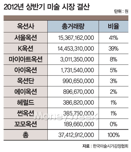 협회는 서울옥션, K옥션, 꼬모옥션, 옥션단, 에이옥션, 마이아트옥션, 아이옥션, 헤럴드아트데이옥션, 썬옥션 등 활발한 미술품 거래가 이뤄지는 경매사 9곳의 경매 결과를 분석했다. 서울옥션의 경우 지난해 153억6700만원 어치의 미술품을 거래했고 K옥션은 144억5300만원어치를 거래했다. 두곳의 총거래량이 전체 거래의 약 80%를 차지했다.