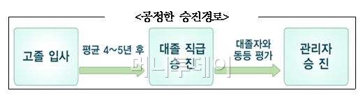 고용부는 또 능력과 열정이 있는 고졸자들이 입사 후 공정한 대우를 받고 지속적인 능력개발을 통해 발전할 수 있도록 구체적인 경로도 마련할 작정이다. 공공기관을 대상으론 공정 경쟁과 적합한 인사·보수 제도를 마련해 주고, 민간 기업들에겐 업종별 특화 컨설팅 서비스를 진행하는 등 열린 고용 참여를 확산할 방침이다. 특히 입사 후 일정기간이 지나면 대졸과 동등한 대우를 받을 수 있는 승진 경로를 마련하고, 창업 지원 확대 등을 통한 고졸 청년의 창조적 도전을 도울 예정이다.