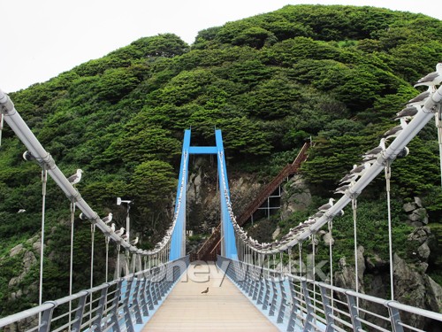 엘리베이터를 통해 7층에 올라 목재펜스 탐방로를 따라 걷다보면 연도교를 만난다. 길이 140m, 폭 3m로 차가 다닐 수 없는 다리지만 그 위용에 압도될 만큼 화려하다. 울릉도 터줏대감인 괭이갈매기가 다리의 주탑과 케이블을 점령한 채 낯선 이방인을 주시하는 게 이색적이다. 다리 위에서 보는 바다는 태하등대에서 바라본 북쪽 해안과 삼선암 남쪽 선녀탕과 더불어 최고의 색깔을 자랑한다.