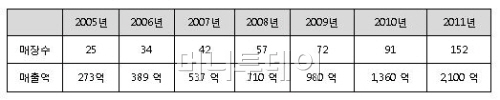 1999년 첫 출점 이례, 2005년 25개, 2010년 91개 매장을 오픈한 데 이어, 2012년에 200호점을 돌파한 것이다. 현재는 직영점 60%+가맹점 40%비율로 오픈된 상태이다.