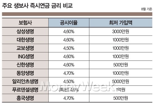 현재 특판 상품을 제외한 대부분의 즉시연금 상품은 연 4.5~4.7%의 공시이율을 적용하고 있다. 8월 기준으로 동양생명과 흥국생명이 연 4.7%의 금리를 적용하고 있으며,삼성생명(244,500원 ▼11,000 -4.31%)·대한생명(4,965원 ▲115 +2.37%)·ING생명·신한생명 등은 4.6%를 적용해준다.