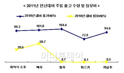 두 번째, 맥주판매량의 증가이다. ‘2011년 국내주류시장 동향’에 따르면 소주는 전년대비 출고량 0.7%, 매출액은 0.6% 감소한 반면, 맥주는 전년대비 출고량 1.8%, 매출액 2.3% 증가한 것으로 조사되었다. 또한 국내 전체 주류 출고량 중 맥주가 58.7%를 차지하고 있는 것으로 나타났다.