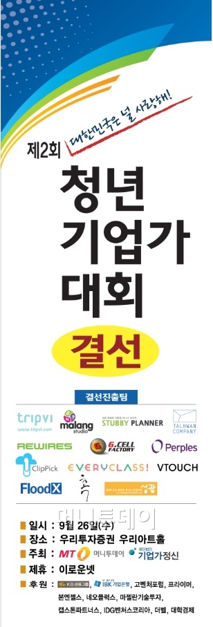 머니투데이와 기업가정신재단(이사장 이장무)는 19일 제2회 청년기업가대회 결선 진출팀으로 △섬광 △지셀팩토리 △FloodX △Tripvi △촉 △에브리클래스 △말랑스튜디오 △스투비플래너 △센텐스 △Vtouch △탈환1기 △퍼플즈 △리와이어스 (서류 지원 순) 등 13개팀을 최종 선정했습니다.