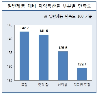 지역특산물에 대한 만족도도 높게 나타났다. 일반제품의 만족도를 100점으로 놓고 비교했을 때 지역특산물의 만족도는 '품질'이 평균 142.7점으로 높은 점수를 얻었다.