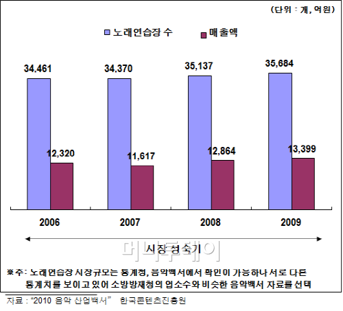 노래연습장 업계 관계자는 “노래연습장 시장은 2006년부터 연평균 408개 업소, 증가율 1.2%를 기록하는 등 성장률은 미약하지만 아직도 시장규모를 꾸준히 유지하고 있어 시장이 성숙기 접어들었다고 판단하는 것이 올바르다”고 전망하고 있다.